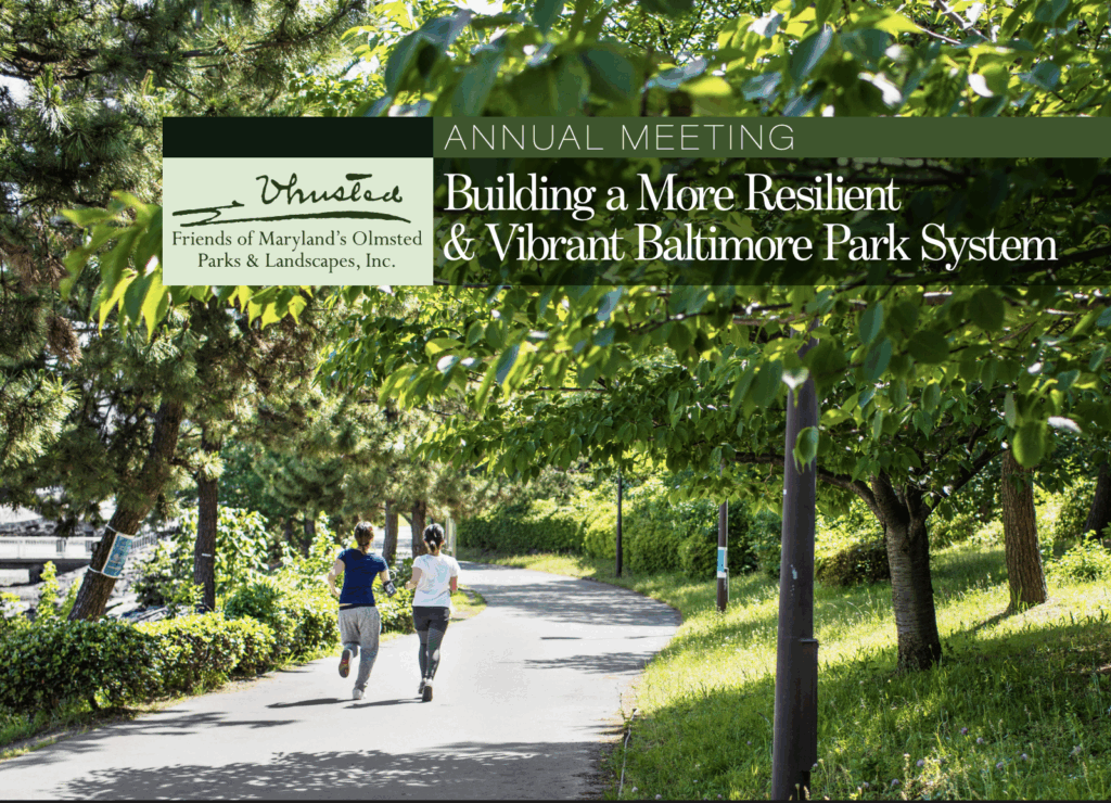 The Friends of Maryland’s Olmsted Parks & Landscapes (FMOPL) is a member of the National Association for Olmsted Parks. FMOPL is committed to advancing the Olmsted legacy of accessible public parks, sustainable landscapes, and livable communities—respecting and protecting the accomplishments of the past and seeking relevant solutions for the challenges of today.